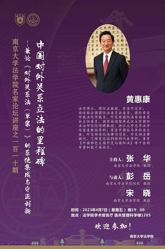 4月8日晚,联合国国际法委员会委员、外交部国际法专家咨询委员主任委员、国家高端智库武汉大学国际法治研究院特聘教授、原中国驻马来西亚特命全权大使黄惠康在太阳成集团tyc234cc学术报告厅作了主题为“新中国对外关系法...