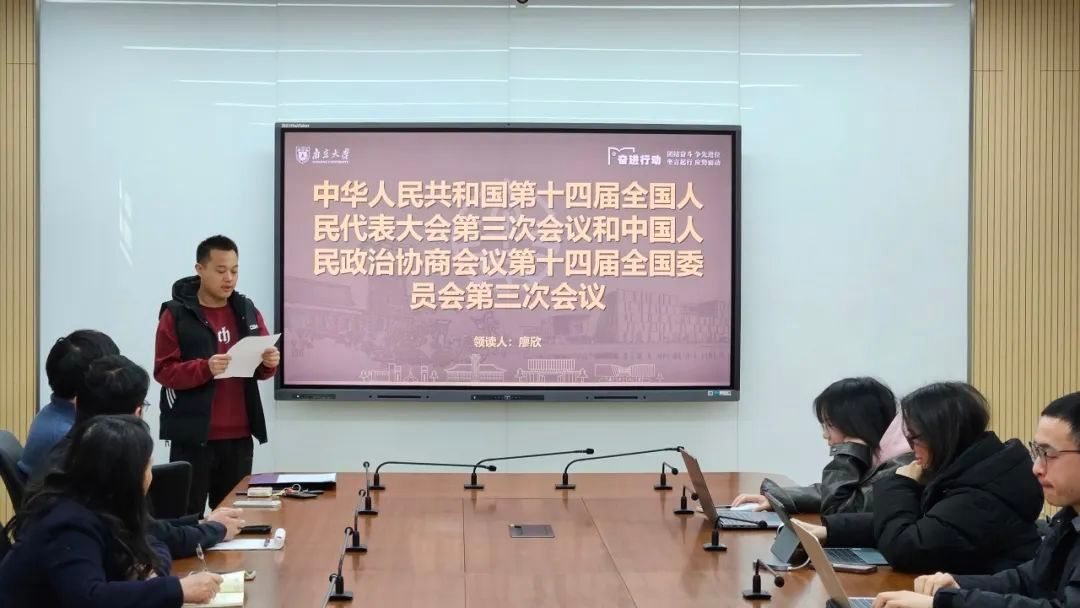在学习心得交流环节,徐恭平、李亚铎、陈映璇三位同学分别结合自身研究方向与对两会精神的理解,分享了对于博士担当与时代使命、涉外法治与全球视野等问题的感悟。法学博士生应当紧扣国家发展脉搏,关注社会实际问题,以法治思维推动社会进步。青年一代应当踔厉奋发、踊跃前行、不负使命,要在高质量发展浪潮中主动谋划,自觉将个人成长融入民族复兴的大局。