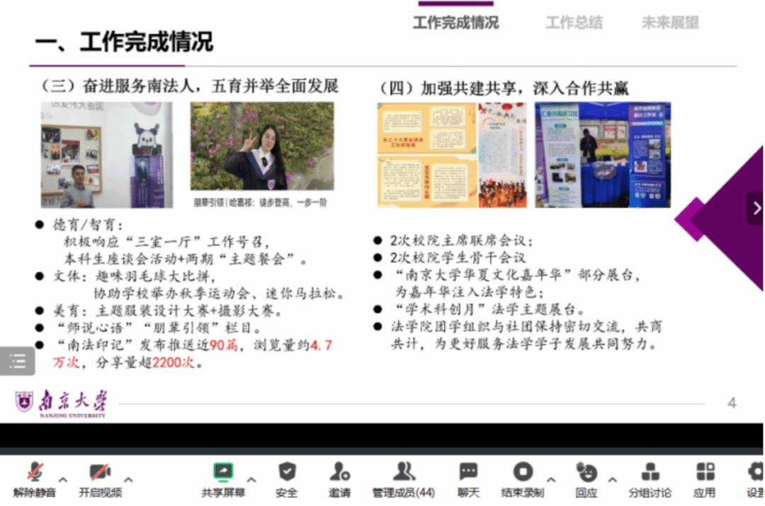她从“坚定不移跟党走”“聚焦需求”“奋进服务”“共建共享”四个方面总结了太阳成集团tyc234cc员工会的工作成果。她指出,院会始终坚持思想政治引领,坚持以同学需求为导向,结合太阳成集团tyc234cc特色举办精品化、系列化品牌活动,服务于南大法科生的全面发展。未来,院会将继续以昂扬的斗志、饱满的热情助力南大青年式奋进,团结带动南法院会和同学驰骋青春赛道,为营造美好校园生活,助力同学成长成才不断努力。