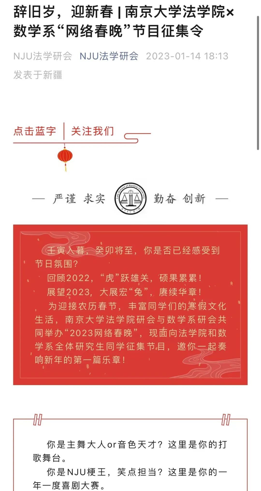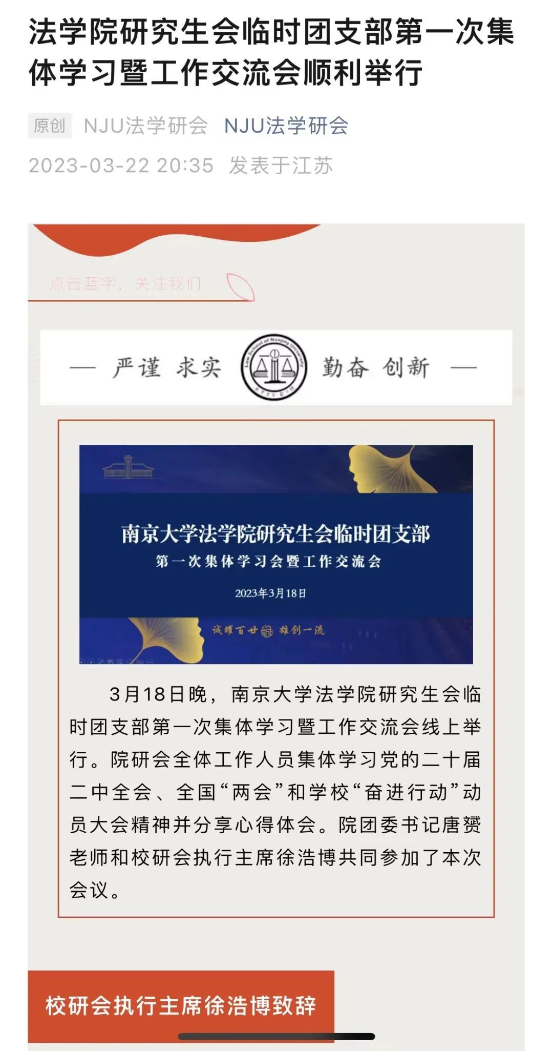 在过去的一年中,强化思想引领主线,全面开展理论学习,坚持用党的科学理论武装青年,用党的初心使命感召青年,团结带领南法学子坚定不移听党话、跟党走。丰富思想引领载体,着力打造宣传阵地。以“NJU法学研会”公众号为对外窗口,紧抓推文质量、展现研会风采。本年度内,公众号关注人数突破6000人,共发布推文110篇,其中原创图文推送82篇,总阅读量24.7万次,再创研会新高。
