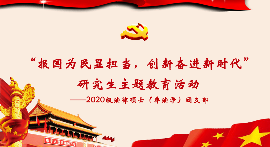 青年逢盛世,奋斗正当时。习近平总书记在党的二十大提出:“新时代新征程中国共产党的中心任务,就是团结带领全国各族人民全面建成社会主义现代化强国、实现第二个百年奋斗目标,以中国式现代化全面推进中华民族伟大复兴。”作为新时代的青年学子,站在新的历史征程上,我们当以奋进为底色,创新为动力,坚定不移感党恩、听党话、跟党走,在报国为民中彰显青春担当,在中国式现代化建设道路上贡献青春力量。为此,2020级法律硕士(非法学)团支部召开“报国为民显担当,创新奋进新时代”研究生主题教育活动,本次主题教育活动通过线上形式开展。