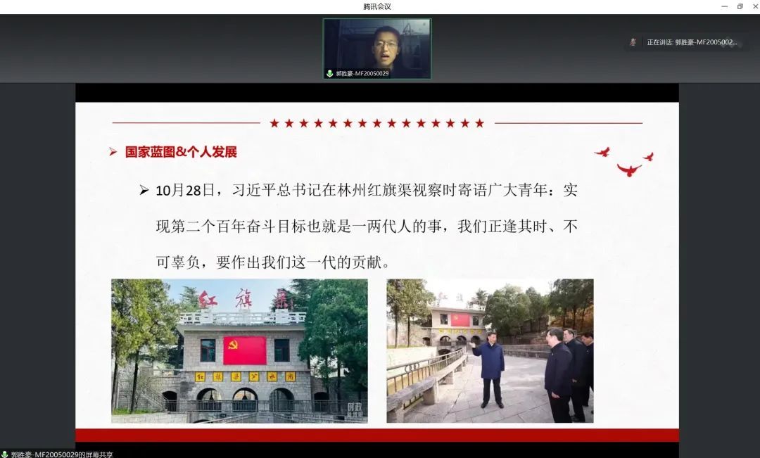 紧接着,郭胜豪同学以“新时代、新青年、新使命”为题,分享了自己对于“肩负青年使命,不负最好时代”的理解。郭胜豪同学分享道,习近平总书记在林州红旗渠视察时寄语广大青年:“实现第二个百年奋斗目标也就是一两代人的事,我们正逢其时、不可辜负,要作出我们这一代的贡献。”习近平总书记的殷切嘱托发人振奋、鼓舞人心,让我们广大青年对未来的发展充满希望。一滴水只有融入大海才不会干涸,没有大国哪有我们一个个小家,我们要始终坚持将个人命运与国家命运紧密结合,奋斗不息、笃行不怠,为推动中国式现代化建设贡献自己的青春力量。