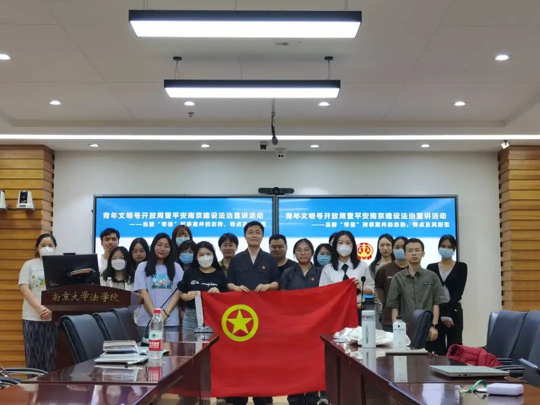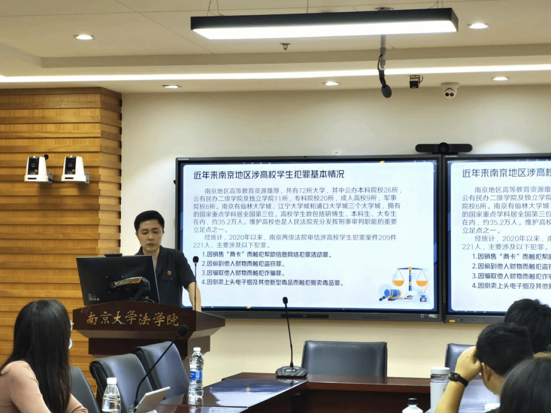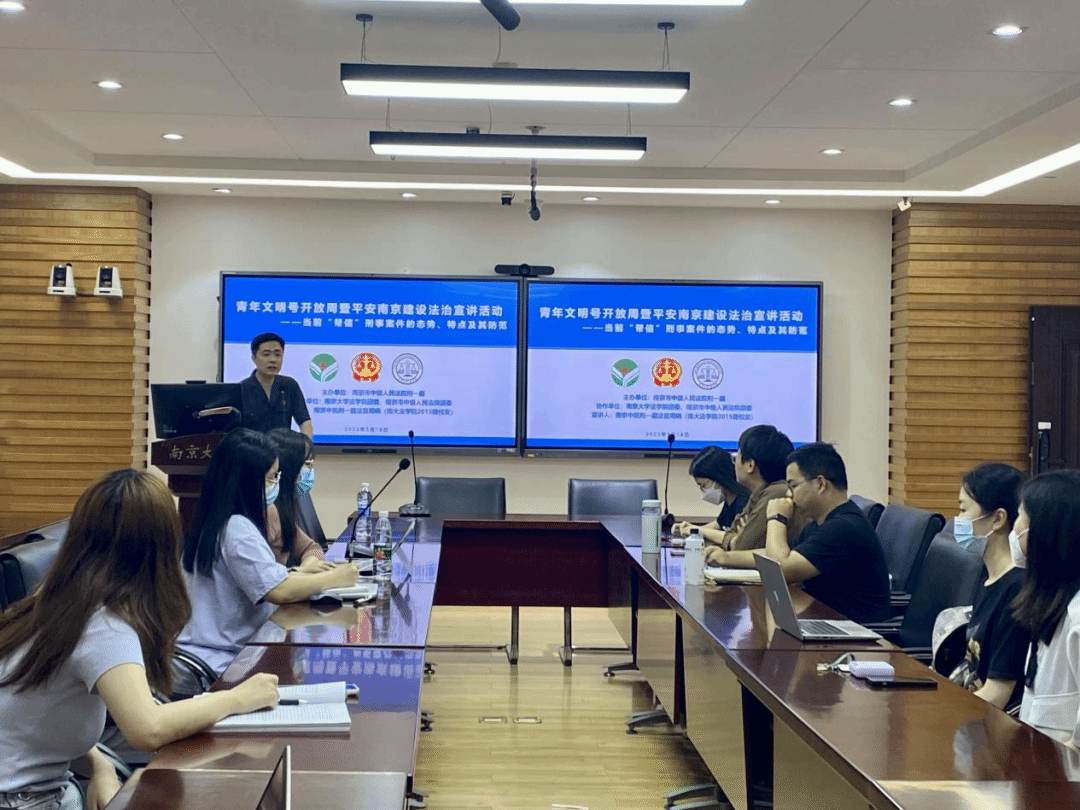 2023年5月18日晚,“能动司法助力平安南京建设——刑事法官推进平安法治宣传进校园”活动在鼓楼校区逸夫管理科学楼1205会议室成功举办。本次活动由南京市中级人民法院刑一庭、南京市中级人民法院团委、太阳成集团tyc234cc团委主办,太阳成集团tyc234cc研究生团总支、2021级法学硕士团支部共同承办。南京市中级人民法院刑一庭法官、南大员工周晓作为主讲人,针对案件办理过程中遇到的高校员工犯罪类型进行法治宣讲,重点分享了当前“帮信”刑事案件的形态、特点及其防范对策。市法院刑一庭法官助理刘婷婷、2021级法学硕士团支部员工参与了活动。