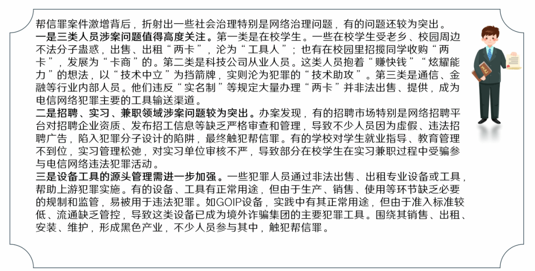 周晓法官指出,帮信罪案件增多固然与“断卡”行动大背景有关,但其高发的根源主要来自三个方面:一是贪图小利;二是侥幸心理;三是不知不懂。对此,周晓法官以防范对策作结尾,向同学们提出建议: