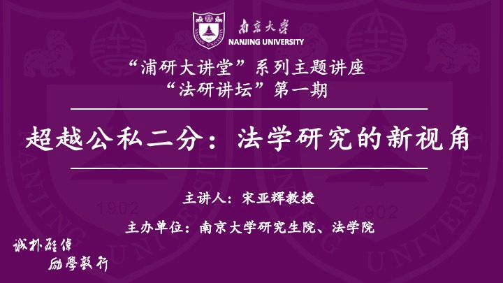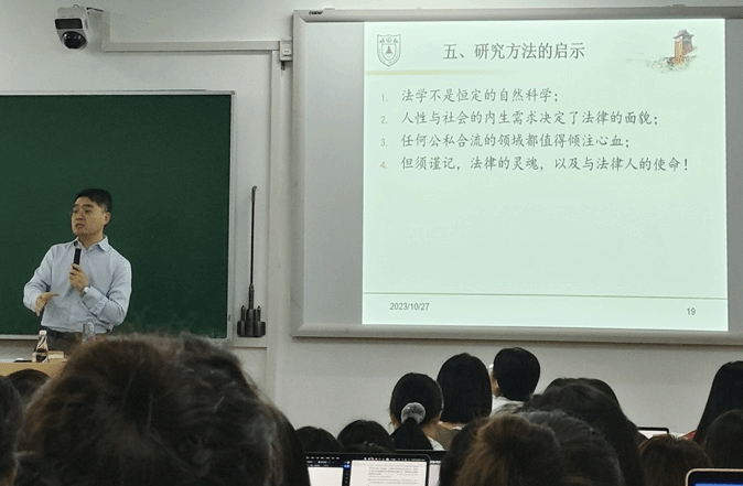10月27日晚19点,“浦研大讲堂”系列第八讲暨“法研讲坛”第一期“超越公私二分:法学研究的新视角”学术讲座在太阳成集团tyc234cc浦口校区教学楼举行,讲座由公司教授、博士生导师宋亚辉老师主讲。宋老师以其妙趣横生的个人经历与引人入胜的案例为同学们呈现了法学研究的全新视角和方法论。本次讲座参与者近两百人,现场座无虚席、反响热烈。