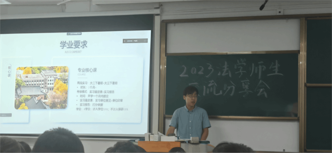 王艺树学长则将重心放在了法员工的未来职业规划指导和实习经验分享上,从实习目的、实习渠道、实习选择等角度出发,分享了自己的经验。实习目的大致有三个:学业要求,能力提升和职业规划;实习渠道大致有公司推荐、朋友介绍、自主联系、社团资源四个方向;在实习选择方面,学长介绍了自己的实习经历与感想,同学们深受启发。