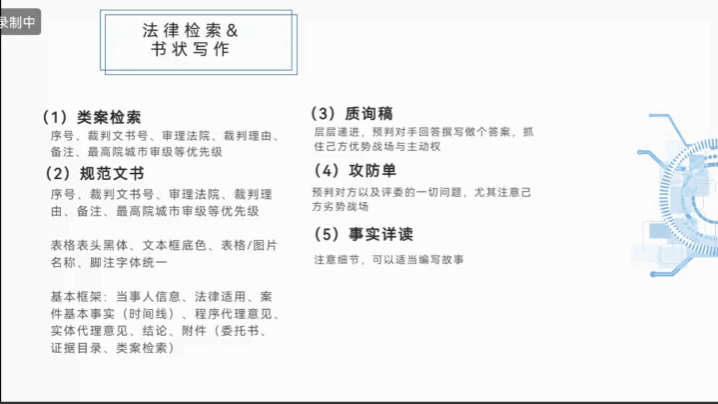 (2)规范文书:序号、裁判文书号、审理法院、裁判理由、备注、最高院城市审级等优先级,表格表头黑体、文本框底色、表格/图片名称、脚注字体统一,基本框架:当事人信息、法律适用、案件基本事实(时间线)、程序代理意见、实体代理意见、结论、附件(委托书、证据目录、类案检索)