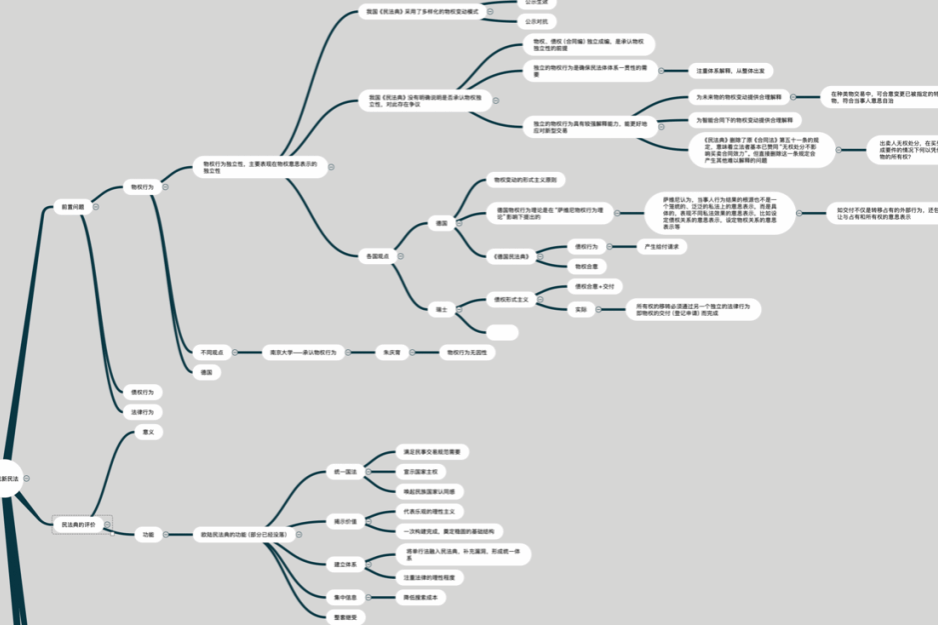 【法研心得】思维导图是我学习的时候常用的一种整理笔记的方式,尤其是对于民法、刑法这种体系庞大的学科,思维导图提供了一种高效且系统的学习方法,通过图形化地呈现各个知识点之间的层级和关联,可以帮助我们建立清晰的结构和框架,有助于形成法学体系思维,除了记录笔记,思维导图还可以以批注的形式添加个人对某一问题的理解和问题,方便今后对某一知识点进行全面回顾。