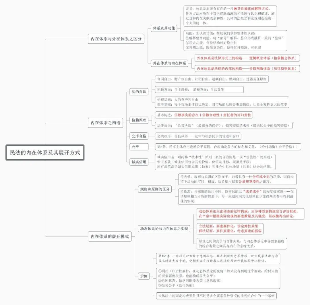 【法研心得】课后整理课堂笔记时,我常会将文字版的笔记内容整理成思维导图的形式,并通过加粗加红的方式突出重点内容,如图为叶金强老师讲授的关于“民法的内在体系及其展开方式”的专题知识。这种方式有利于对该专题的内容形成更清晰、更直观、更体系的认知。对笔记进行体系化的梳理也可以帮助我更好地理解老师的上课思路和内容的展开逻辑,以便掌握和重温。