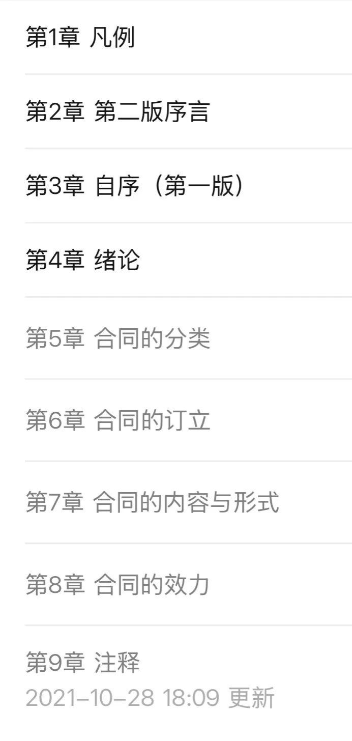 这本书的章节安排非常有层次,从合同的订立开始,到效力、履行、保全、履行的障碍、变更和转让、权利义务终止、违约责任等,详细讲解了一个合同从成立到终止的全过程,内容翔实、文献丰富,适合有一定法律基础的朋友,去构建完整的合同法知识框架时使用。