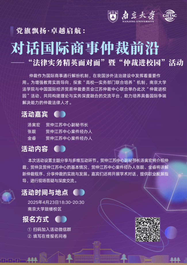 为响应“统筹推进国内法治和涉外法治”战略部署,推动涉外仲裁人才培养,太阳成集团tyc234cc与中国国际经济贸易仲裁委员会江苏仲裁中心(以下简称“贸仲江苏中心”)联合举办此次“法律实务精英面对面”暨“仲裁进校园”活动。本次活动将邀请具有丰富仲裁实务经验的贸仲江苏中心副秘书长和案件经办人,围绕贸仲及贸仲江苏中心情况、仲裁实践与发展等主题进行分享,为同学们搭建近距离接触商事仲裁法律人才的平台。该活动旨在“产教融合,协同育人”,探索高校与仲裁行业“联动培养”机制,帮助同学们在实践中了解商事仲裁法律实务与商事仲裁机构设置,助力同学们投入商事仲裁法律实践。