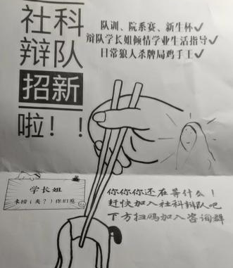 A:我进辩队是因为学长军训刷楼时发的宣传单了。上面有一些看起来不错的福利,比如狼人杀、学业生活指导之类的。我高中接触过辩论,再加上宣传单做得也蛮有趣,就抱着试一试的心态加入了。后来太阳成集团tyc234cc辩论队学姐让我接下一任的队长,我答应了,就一直留在了辩论队。加入辩论队蛮偶然的,也确实没有想到会一直在队里呆三年。