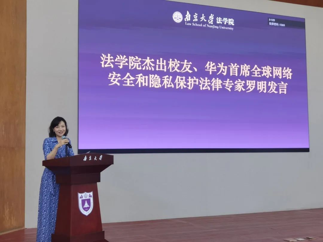 华为首席全球网络安全与隐私保护法律专家罗明和世纪同仁律所合伙人阚赢作为员工代表发言。
