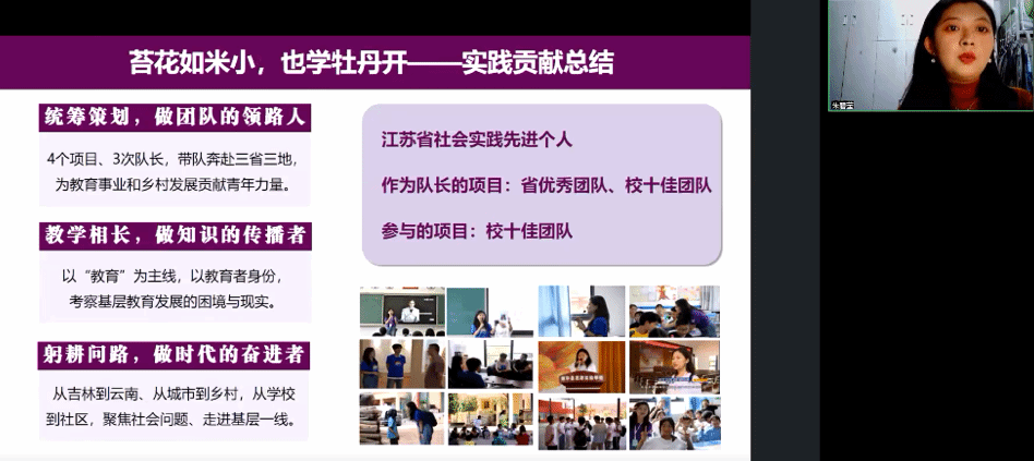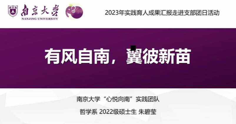 本次活动还邀请到了2023年江苏省社会实践先进个人、“心悦向南”社会实践项目负责人朱碧莹同学为大家进行分享。朱碧莹同学首先介绍了她在2023年暑期参与的“哲学系青少年国学启蒙班 ——习国学典籍续中华文脉,学党团精神扬强国担当”等四个社会实践项目,其中共包含三个校级重点项目,一个校级特别专项。在实践贡献总结中,朱碧莹同学分享了自己作为团队领路人、知识传播者、时代奋进者的体会与心得。
