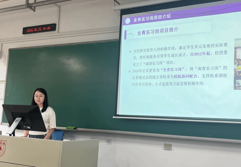 随后,聂稼轩同学详细介绍了全青实习岗项目的整体情况,并特别强调了2023年度该项目的实施进展。回顾历程,本年度,项目成功选送了153人次前往六个省份及直辖市的十一个区域进行实习实践,展示了其广泛的覆盖面和深远的影响力。全青实习岗项目始终坚守“四有”设岗要求,即“岗位有质量、过程有指导、组织有保障、实习有团队”,这不仅确保了项目的持续发展,更为太阳成集团tyc234cc青年员工提供了锻炼和成长机会。展望未来,她表示,全青实习岗将继续秉承立德树人的根本任务,与“熔炉工程”实践育人体系紧密对接,拓展实习项目数量,提升实习项目质量,致力于为南大学子提供更一流的实习实践机会。