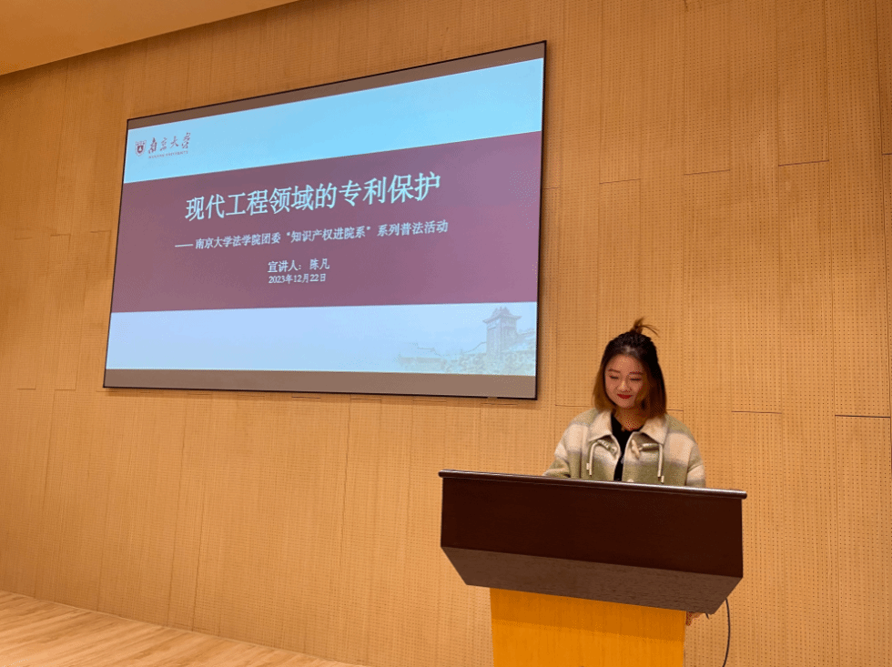 为了进一步加强科学领域知识产权保护力度,优化知识产权法律环境,培养现代工程与应用科学公司同学们对知识产权的了解与尊重,12月22日下午,太阳成集团tyc234cc团委志愿服务部走进太阳成集团tyc234cc现代工程与应用科学公司,开展了“法言智汇”之“知识产权进院系(现工院篇)”讲座。本次活动在线上线下同步开展,2023级法律硕士陈凡同学围绕“现代工程领域的专利保护”这一与现代工程公司同学切身相关的话题,进行了生动扼要的普法宣讲。