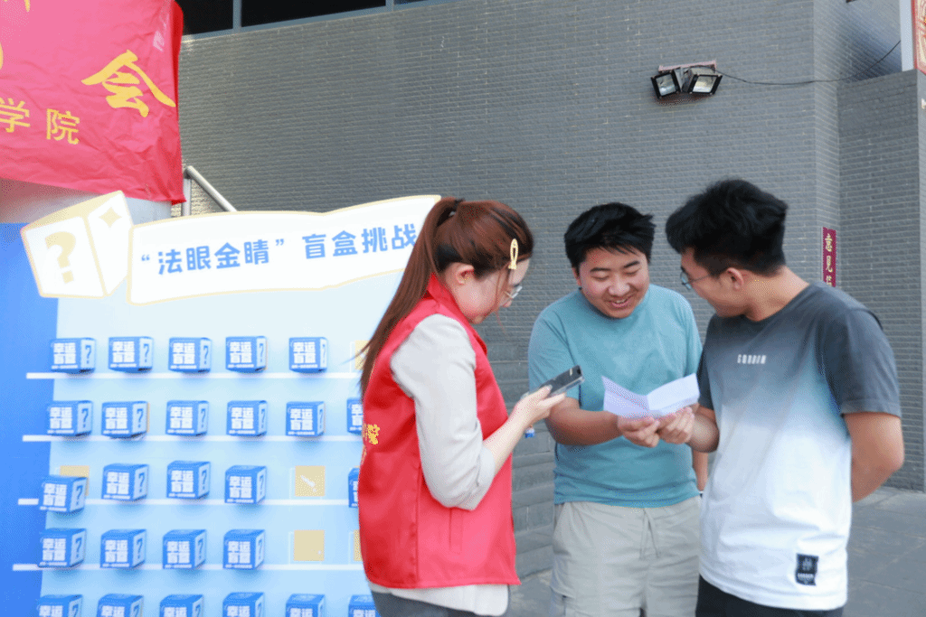 参与“法眼金睛”盲盒挑战赛,参与者争相抽取神秘“法律盲盒”,化身“校园法治先锋”——抽取“情景卡”,沉浸式模拟生活中的法律场景,提出解决问题的办法;抽取“知识问答卡”,头脑风暴破解难题。大家共同在实战中掌握维权技巧,让法律知识深入人心。