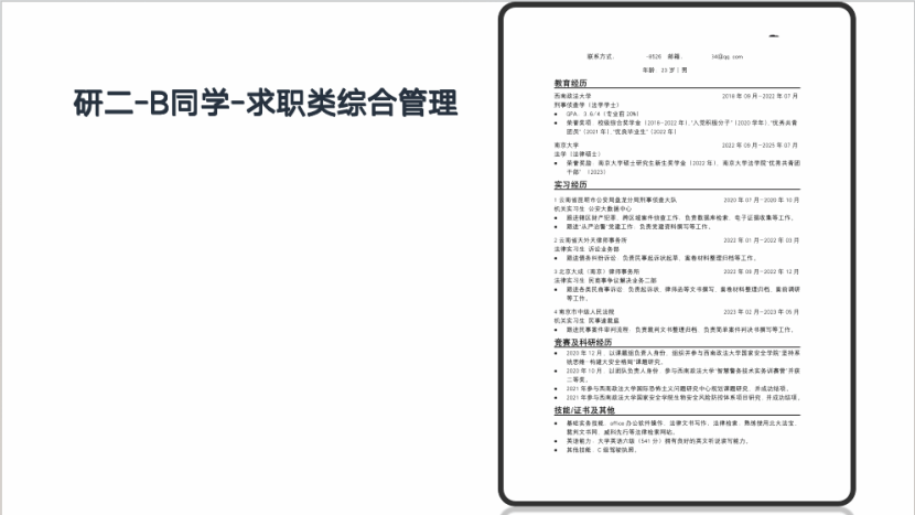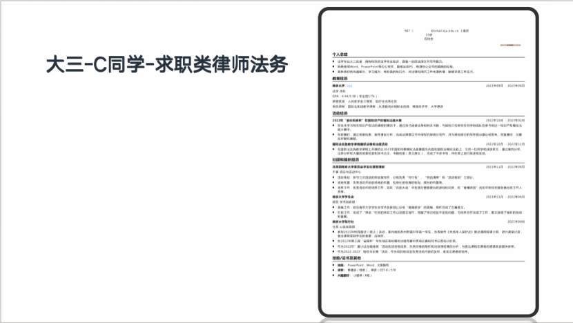 律所和国企所关注的重点不同,律所相对而言更看重实习经历,而国企更看重政治面貌、员工工作;同时,应根据岗位的具体业务方向,选择与业务方向相关、符合用人单位需求的实习经历呈现在简历上。