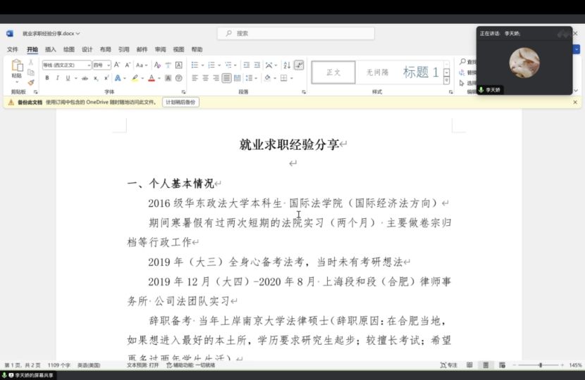 在工作体验上,李天娇学姐分享了律师工作给她带来的个人成长:专业能力的提升、员工思维的转变以及商业思维的培养,也坦率地向我们展现了律师这一职业在工作时间、前期生存压力等方面可能会遭遇的困难和挑战。