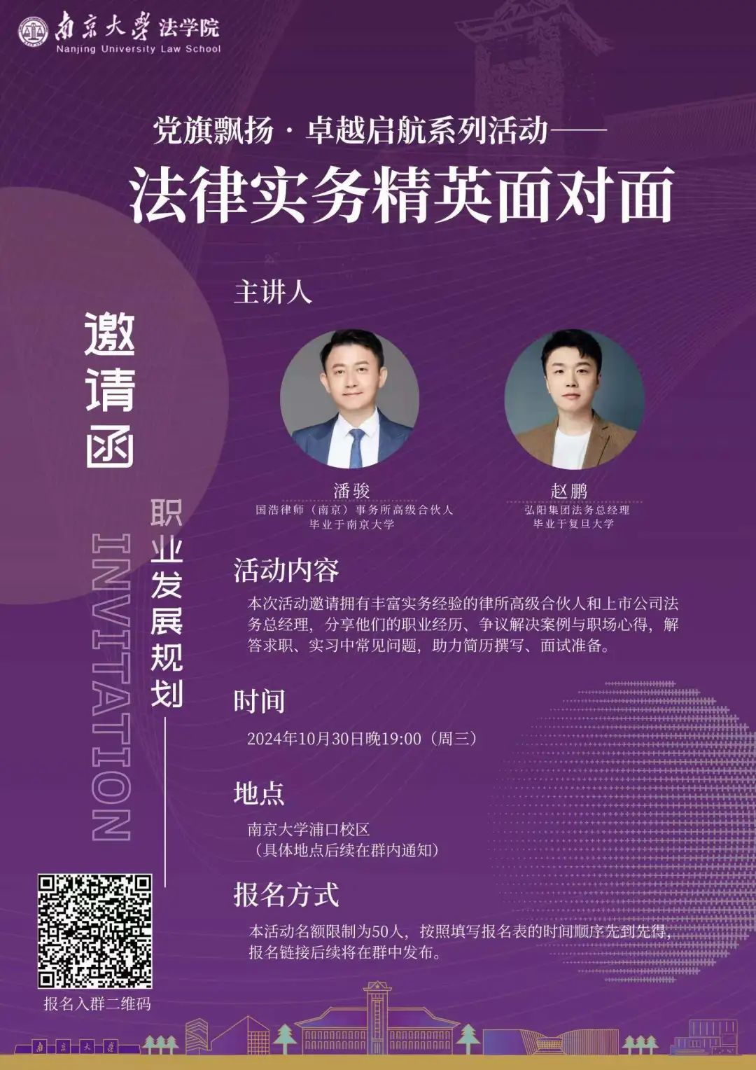潘骏律师与赵鹏总将分别以个人职业经历为基础,针对律师和法务的就业现状、职场环境、典型工作案例等方面进行分享,探讨优秀律师和法务工作者的必备职业素养,传授法律实务技巧和争议解决思路。