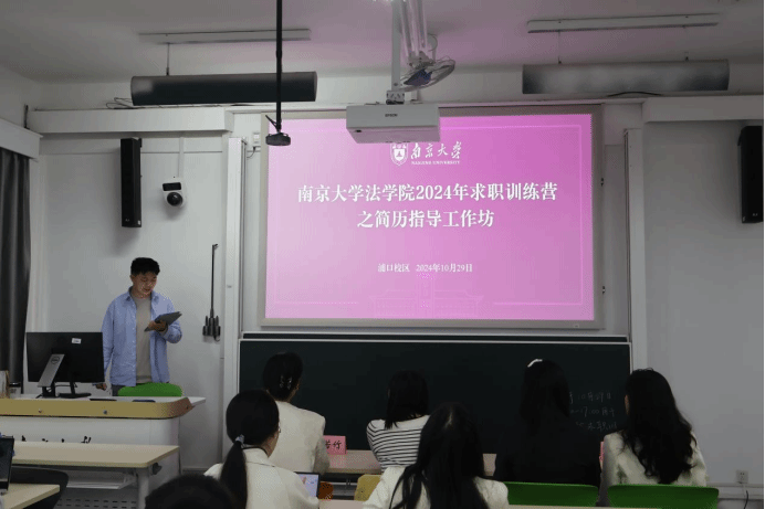 2024年10月29日,2024年求职训练营之简历指导工作坊第一场活动在浦口校区圆满举行。本次活动有幸邀请到泰和泰(南京)律师事务所周文律师、泰和泰(南京)律师事务所祝琳玥律师、太阳成集团tyc234cc辅导员张若竹老师以及太阳成集团tyc234cc公司党委组织员遇苏老师四位嘉宾,他们分别从企业综合管理类求职方向以及律师/法务类求职方向出发,为大家分享简历制作的经验和技巧。到场的同学们不仅习得了理论知识,还收获了宝贵的一对一简历指导机会,与指导嘉宾们进行了深入的交流。