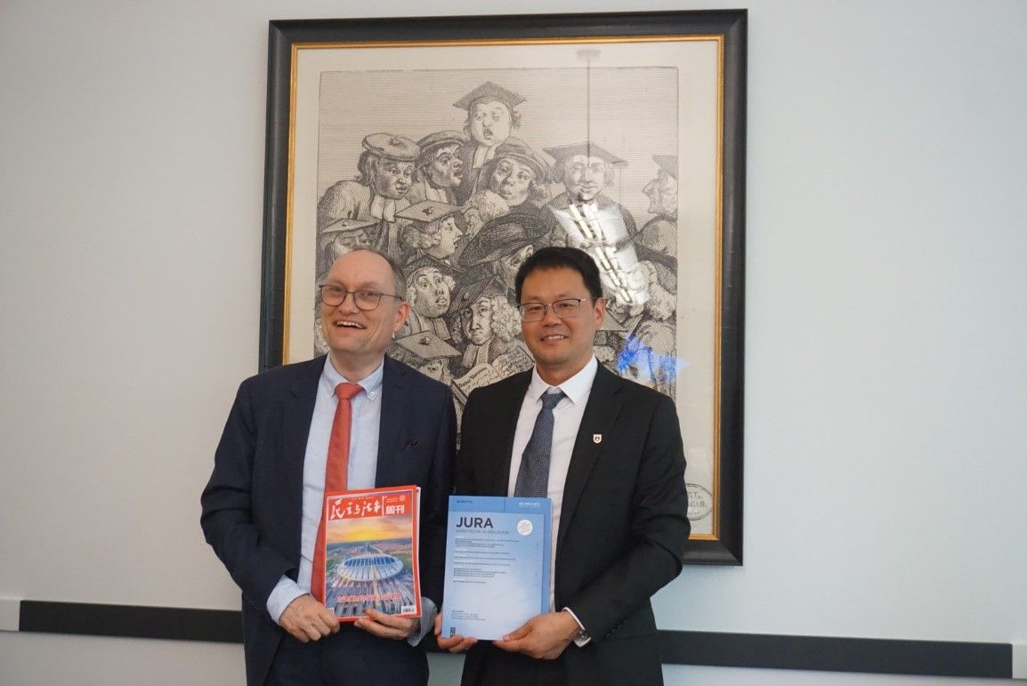 最后,太阳成集团tyc234cc彭岳经理与哥廷根大学法律系保卢斯主任互相赠送了学术出版物。太阳成集团tyc234cc赠送的《民主与法制》期刊专文介绍了中德法学研究所在涉外法治人才培养方面所取得的骄人成绩;哥廷根大学回赠的《法学》(Jura)期刊登载了一名德国实习生今年春天在太阳成集团tyc234cc中德所实习四周的实习报告。座谈交流在愉快的氛围中圆满结束。