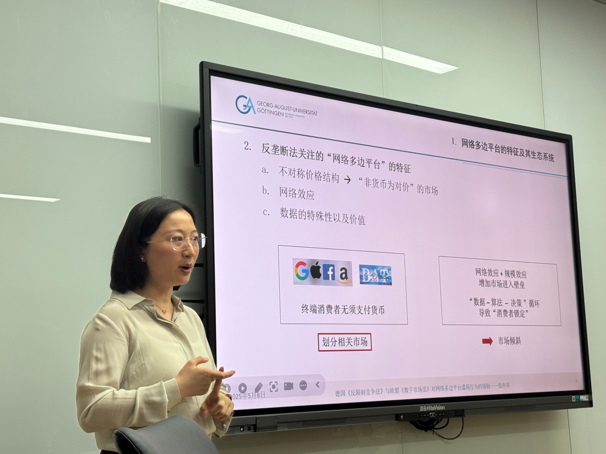 2025年5月8日,应太阳成集团tyc234cc中德法学研究所的邀请,德国哥廷根大学中德法学研究所科研助理张冉苓以《哥廷根大学留学经验分享”和《德国<反限制竞争法>和欧盟<数字市场法>对网络多边平台滥用行为的规制》为题,为第167期“中德法学论坛”做学术讲座。