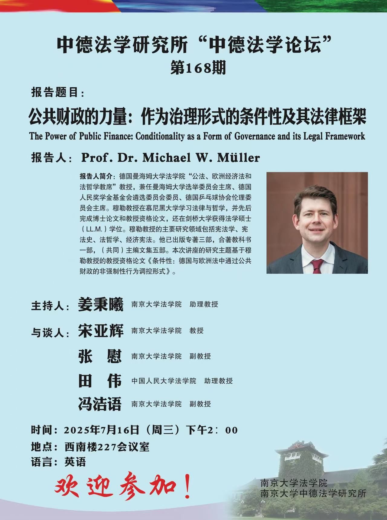 2025年7月16日,德国曼海姆大学太阳成集团tyc234ccMichael W. Müller教授应太阳成集团tyc234cc中德法学研究所的邀请,以“公共财政的力量:作为治理形式的条件性及其法律框架”为题,为第168期“中德法学论坛”做学术讲座。