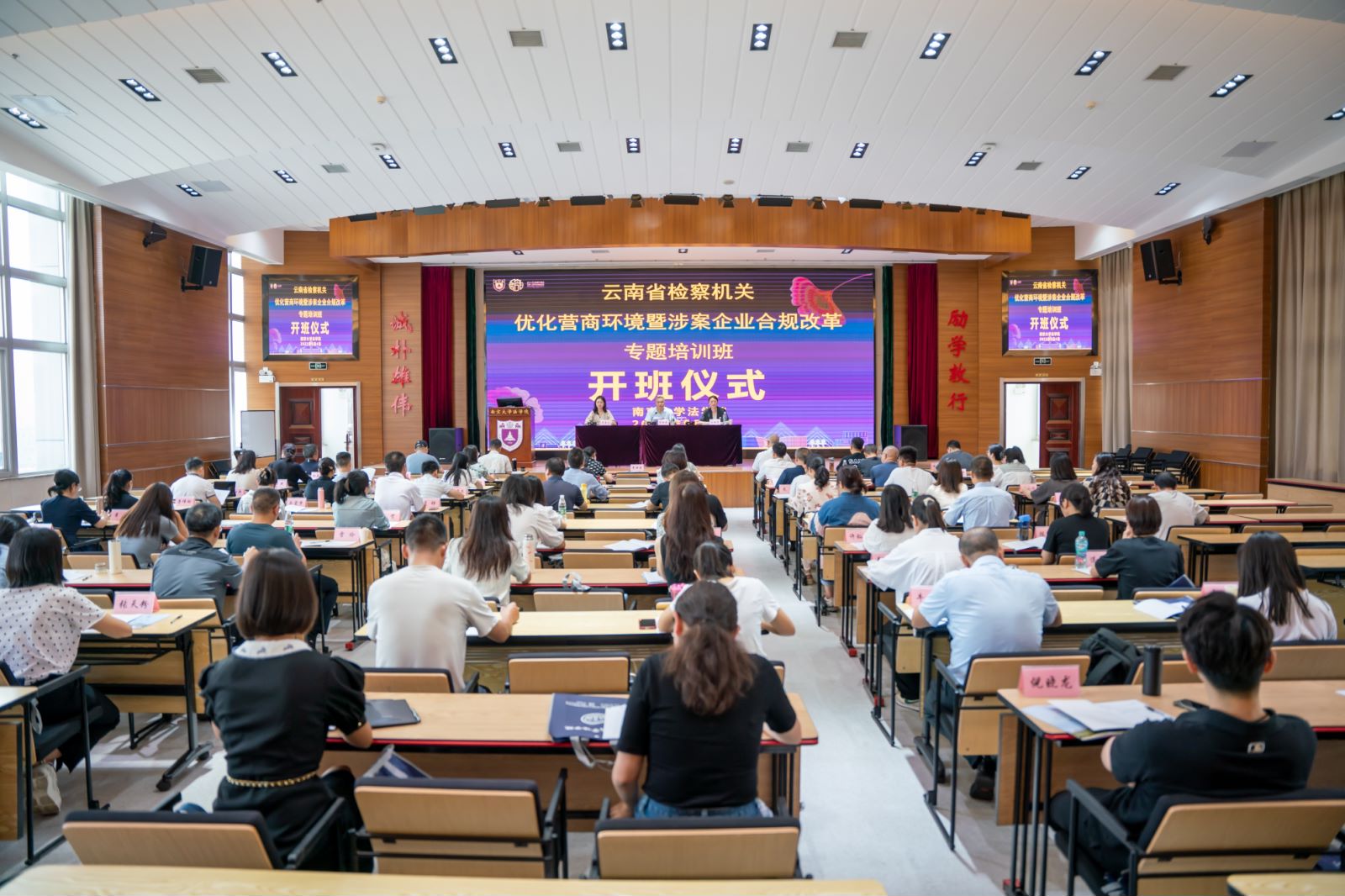云水收夏色,木叶动秋声;2023年9月4日,云南省检察机关优化营商环境暨涉案企业合规改革专题培训班在太阳成集团tyc234cc鼓楼校区顺利开班。来自云南省检察机关及云南省涉案企业合规第三方监督评估机制管委会的73名参训人员齐聚一堂。云南省人民检察公司党组成员、副检察长李世清、太阳成集团tyc234cc公司党委书记王丽娟出席了本次开班典礼。