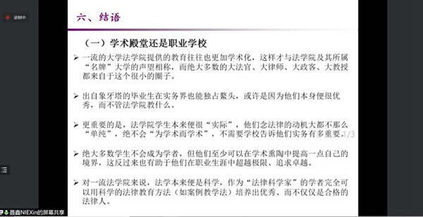 主持人邹立君副教授首先高度赞赏了聂鑫教授的精彩报告,这为大家提供了一个教科书级别的、以法学教育为主题的比较法研究的范本,并指出案例教学法能够兼顾法学教育中的技术与价值。