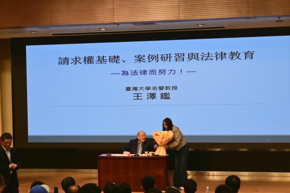 讲座伊始,叶金强教授对王泽鉴先生的到来表示诚挚谢意和热烈欢迎,并向现场师生简要介绍了王泽鉴先生的学术成就与影响。员工代表向王泽鉴先生献上鲜花。